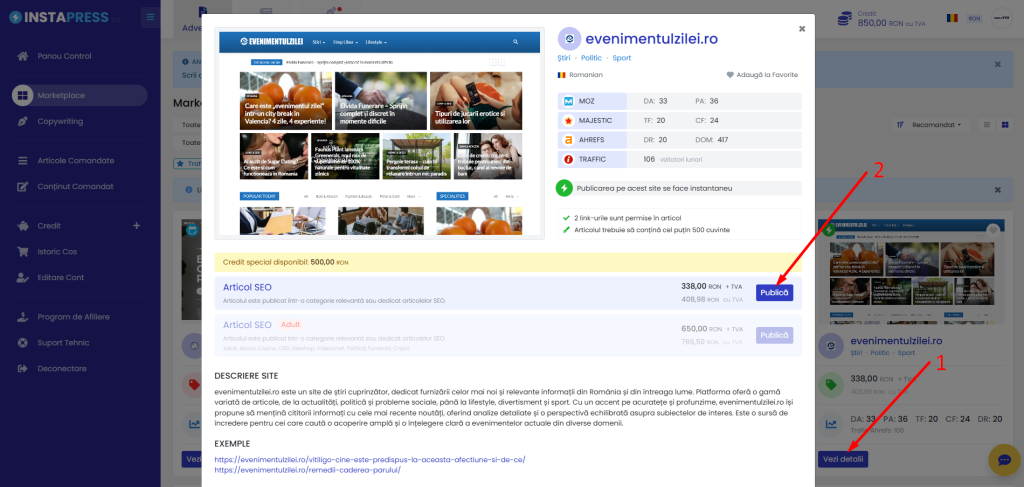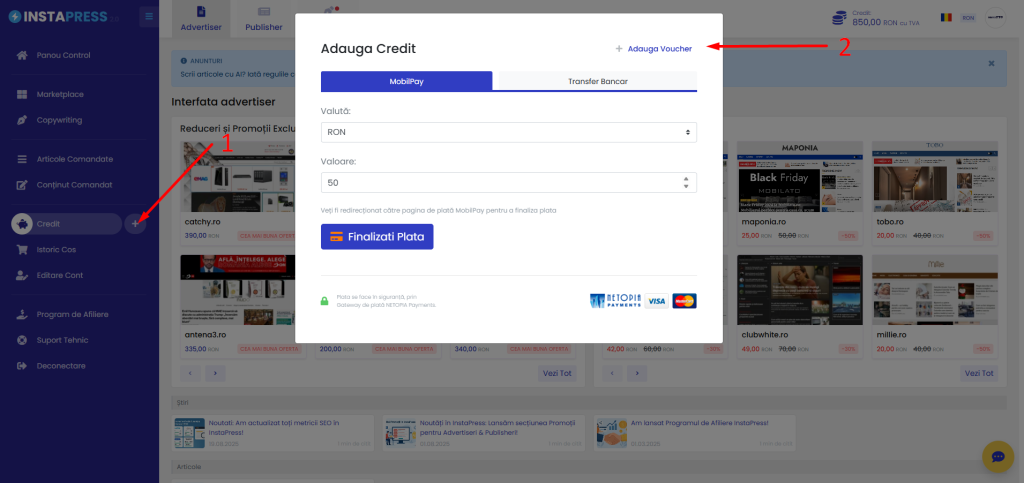 - Apasă pe butonul „Voucher Instapress” pentru a vedea lista de site-uri eligibile unde poți publica folosind voucherul.