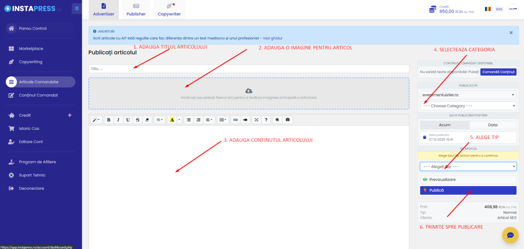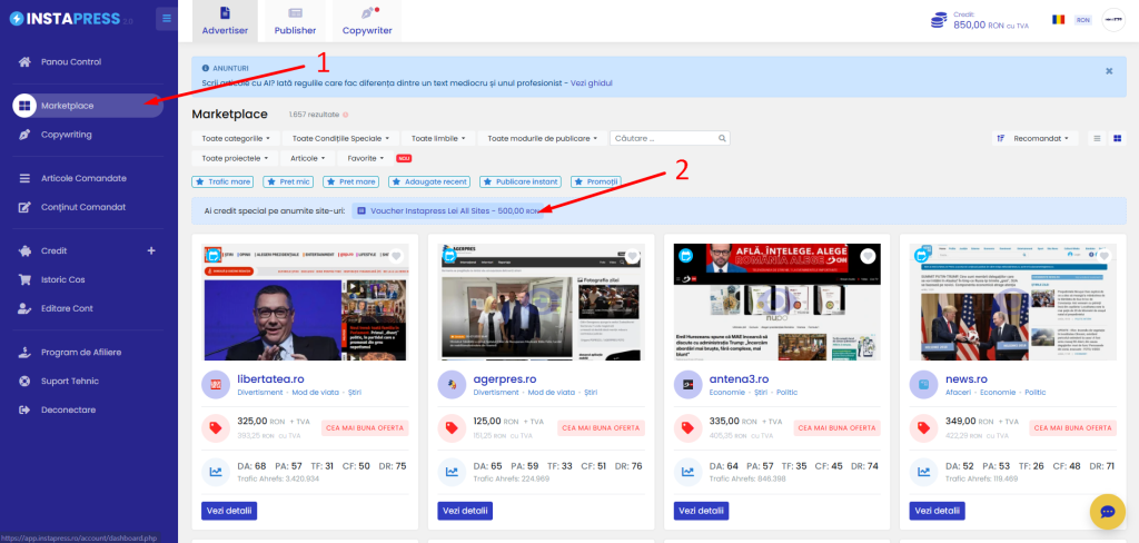 Urmează pașii de mai jos pentru a utiliza voucherul tău și a publica un articol pe unul dintre site-urile disponibile: