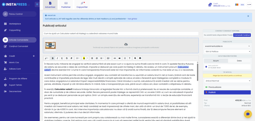 - Tip articol: selectează „Normal”
