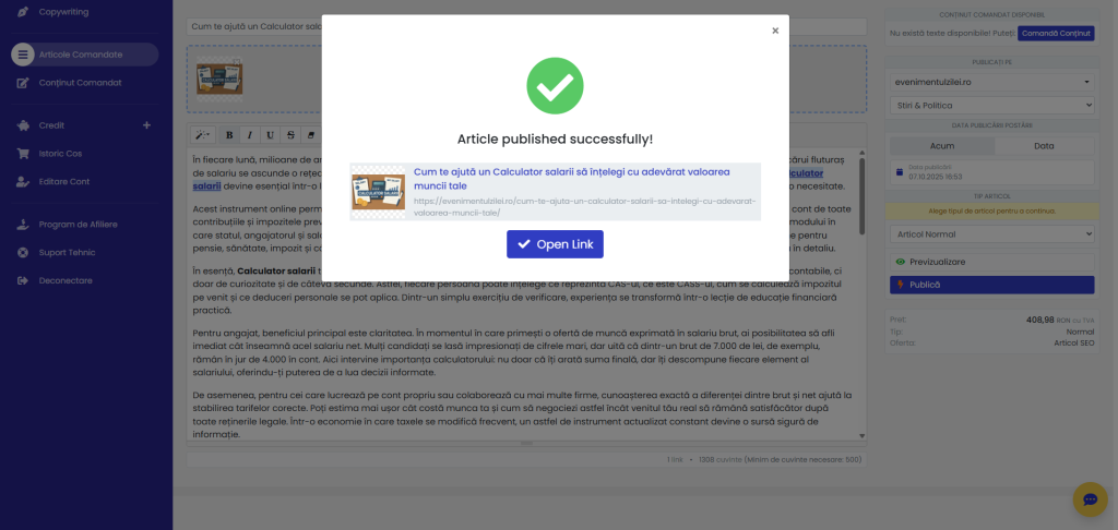 - Dacă ai ales un site care publică instant, ți se va afișa linkul direct către articolul publicat.